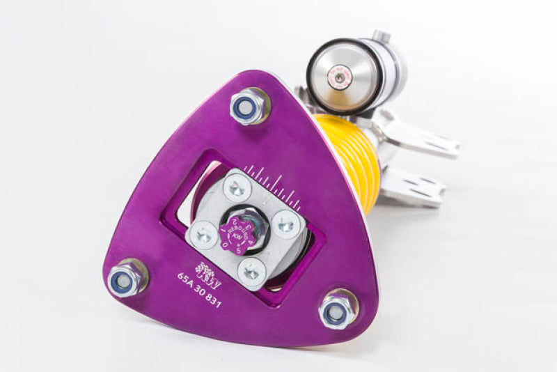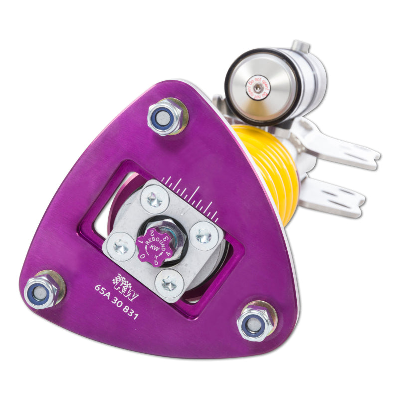 Using the Nordschleife as it's testing grounds and the 7-post rig, KW developed it's V4 Clubsport coilover kit. Wheel loads, vehicle weight and chassis reinforcements (increased body stiffness) can all be taken into consideration with Adjustment -capabilities of the V4 Clubsport. The KW Clubsport coilovers combine KW's high-end racing technology -with maintenance-free KW OEM quality components. Designed to provide you the ideal product to utilize the full potential of your sports car during autocross, track days, high performance drivers education (HPDE) courses, club racing, and is tested rigorously on race tracks such as the Nurburgring Nordschleife. Race teams rely on KW's racing expertise and experience for their vehicle setup. This same championship winning pedigree is mirrored in the development of each one of the KW Clubsport coilover systems. Similar to the KW Competition suspension used in international motorsports, the KW V4 Clubsport coilover kit allows fine tuning of the compression damping separately in the low-speed and high-speed range. The click adjustments of the TVCLH-A valve technology -ake for easy Adjustment -directly on the reservoir. You can modify the low-speed compression damping with 6 precise clicks with the purple low speed Adjustment -ial and directly beneath it the golden Adjustment -heel provides an additional 14 precise clicks of high speed compression adjustment. In addition, the TVR-A technology -provides 16 clicks to noticeably adjust the rebound damping independently of the compression damping. If you would like to adjust the KW V4 Clubsport coilover kit it can easily be adjusted for more comfort or to an alternative setup for a new race track. The KW V4 Clubsport benefits from the same motorsports technology -hat has proven its endurance with multiple overall wins at the ADAC Zurich 24h Nurburgring race.