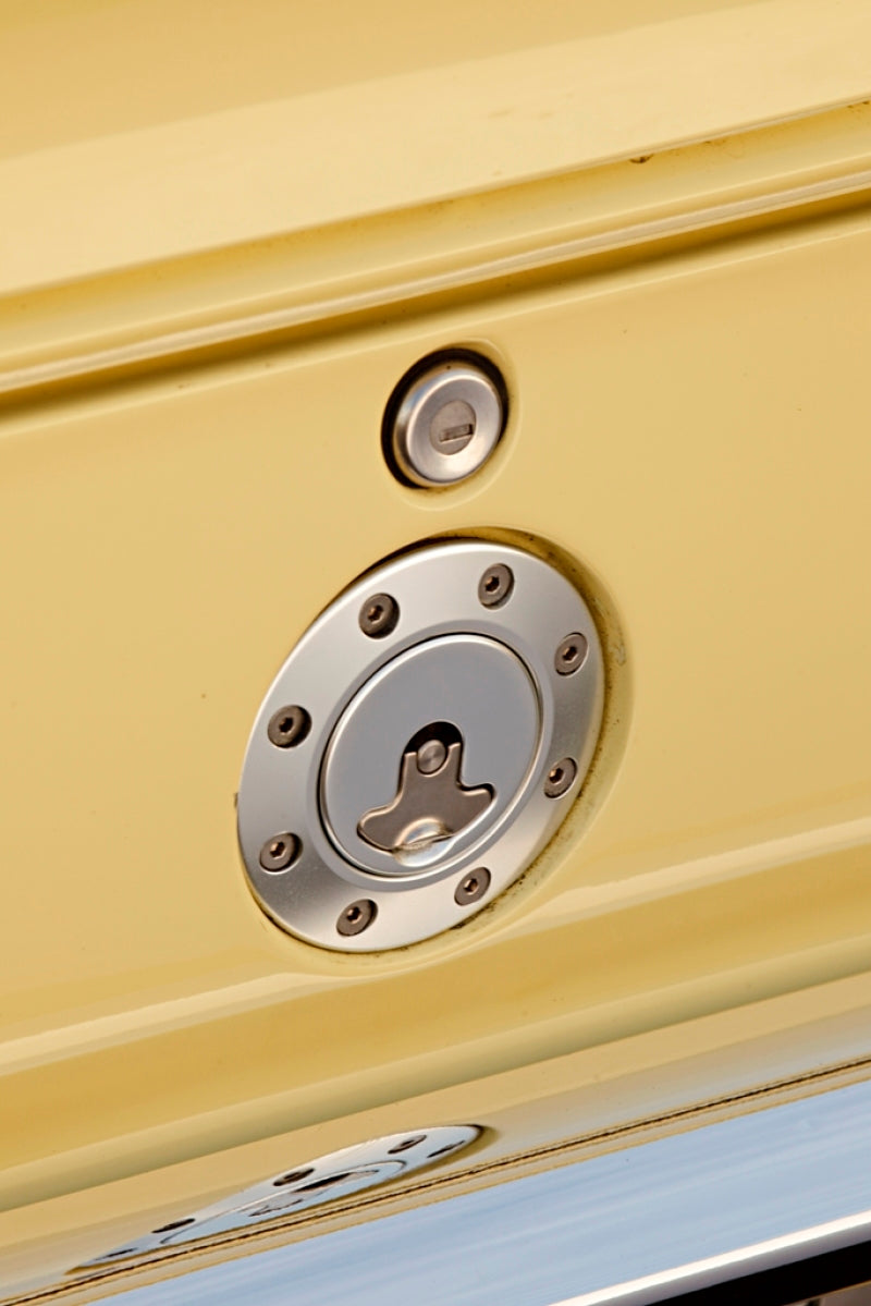 Billet aluminum gas cap for 1967-1968 Camaro, locking, anodized Silver. Includes cap, 2 keys, housing, neck, gaskets, and hose.