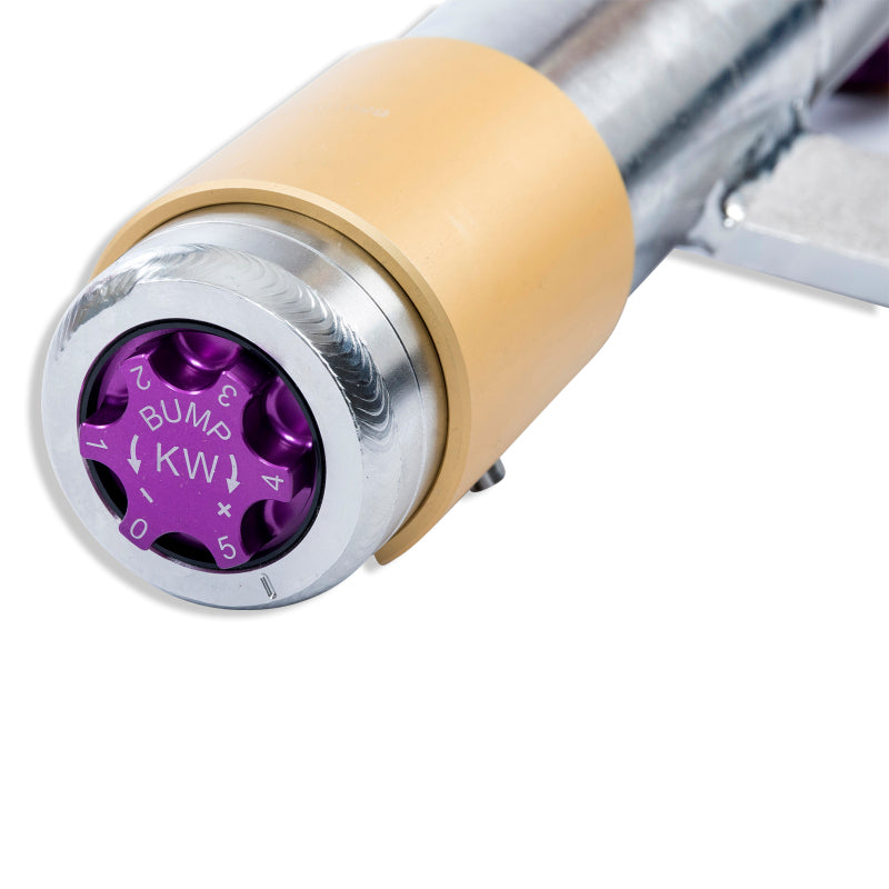 Cutting-edge motorsports technology for more performance on the road. Like every suspension product developed by KW automotive, the suspension manufacturer, and manufactured in Germany, the KW V3 Coilover suspension kit also provides a significant plus in safety reserves in road traffic. Thanks to the chassis with its high-quality dampers, springs, and elastomer spring elements, pitching and rolling movements during load changes such as evasive maneuvers, cornering, acceleration, and braking are significantly reduced. The braking distances are also shortened. Thanks to improved support and feedback, drivers not only feel safer but drivin g in everyday life becomes even safer. With compression and rebound stage damping, that can be set separately and independently of each other, the damper setup can be customized to your personal driving preferences or vehicle changes such as weight, tire characteristics, or altered vehicle rigidity. True performance optimization is only possible with this unique, patented system. For example, this allows the compression damping force to be increased and get more grip from the tires, to improve cornering behavior and reduce squat without simultaneously altering the rebound stage damping which is optimally matched to the spring rate, a scenario which results in reduced grip and the associated loss of performance. The KW V3 coilover kit is the ideal tool for performance-oriented drivers and experienced tuning enthusiasts who place a strong emphasis on the overall performance of their suspension. The Variant 3 features patented TVR-A and TVC-A technology that provides separately adjustable rebound and compression damping. The extensive adjustment range of the independently configurable rebound and compression make it easy to directly influence the steering behavior, directional stability, grip and handling characteristics for confident and repeatable results at the limit of driving dynamics.