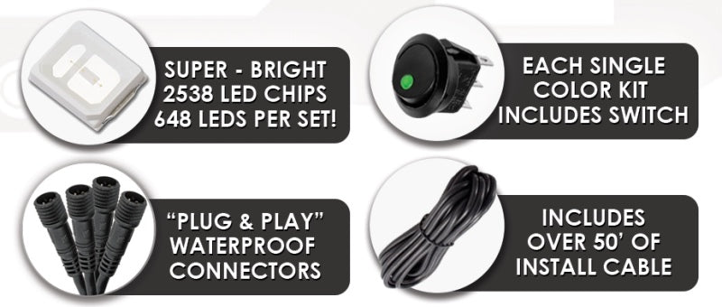 NEW! Double the LEDs. Double the Brightness! Are you looking for the brightest and most attention-grabbing LED wheel ring kit on the market? Look no further than the all-new Double-Wide LED Wheel Ring Kit from ORACLE Lighting! With over 600 LEDs these rings make a powerful impact on any vehicle! The all-new design features Plug and Play waterproof connectors for...