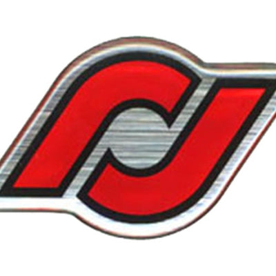 RockJock die cut RJ logo sticker. Brushed metallic background, red and black RJ logo, with...