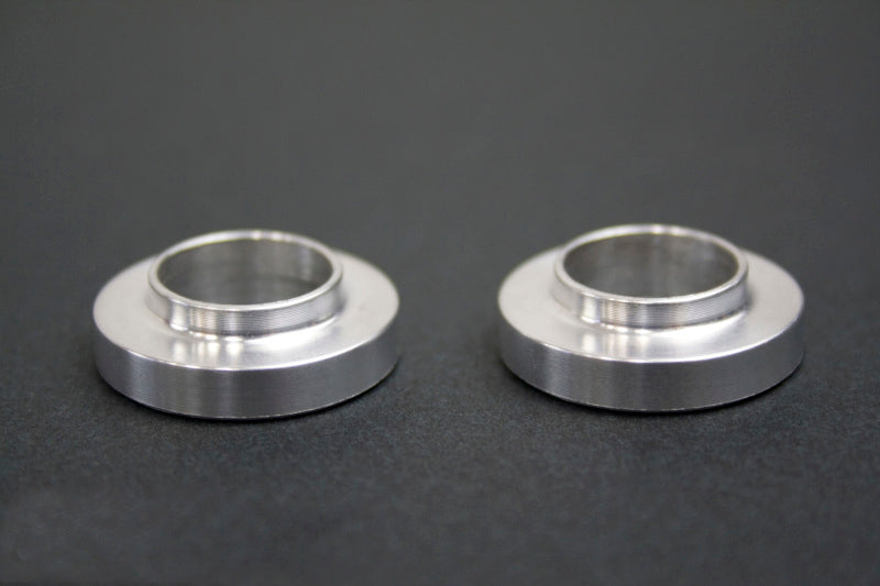 This spacer kit manufactured by UMI Performance is designed to fix the oversized hole problem with the factory rear upper control arm mount. Where the rear upper control arm mounts to the chassis Ford uses a 14mm bolt and a 14mm hole in the upper control arm, however the hole in the chassis mount is 16mm. This stepped spacer set is designed to take up this slop and eliminate noise and clunks from the upper control arm area. This is done by reducing the hole size from 16mm to 14mm which does not allow the bolt to shift during acceleration and braking. The spacer kit slides into the upper mount and steps the hole size down to the correct diameter of 14mm, this allows for a tighter fit and no more clunking!