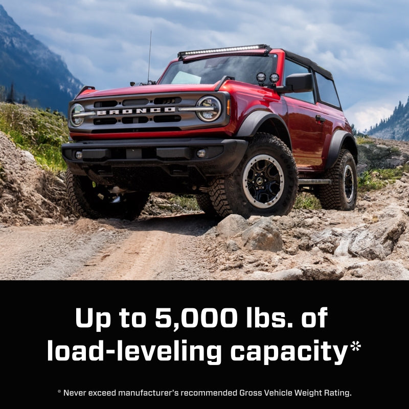 Offering up to 5,000 lbs. of load-leveling capacity, the LoadLifter 5000 kit from Air Lift for the 2021-2024 Ford Bronco will make towing and hauling a comfortable and stress-free experience. Fully adjustable from 5-100 PSI, our air springs are the perfect partner for your vehicle, helping to eliminate problems frequently faced when towing and hauling, such as squat, poor headlight...