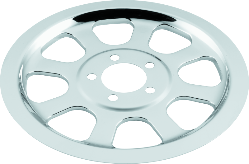 Precision-formed steel insert with eight-hole pattern dresses up rear wheel belt pulley.