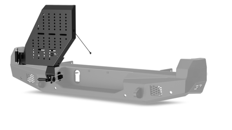 Discover the ultimate adaptable storage solution, designed to mount almost anything you need, from spare tires and jerry cans to tread boards, Rotopax, Hi-Lift jacks, and storage cases. This versatile accessory can be added to your bumper at any time, featuring a built-in foldable table for added convenience. With pre-drilled holes for mounting flexibility, it includes a robust compression latch with a locking pin and serviceable bearings for reliable performance. The brushed aluminum knurled locking pin and stopper prevent over-extension of the swing, ensuring durability. Enjoy easy bolt-on, no-drill installation, though the optional tire/accessory mount is not included. Rated up to 130lbs, this accessory is finished with a durable two-stage light texture black powder coat and comes with a 3-year finish warranty and a limited lifetime warranty. Equip your vehicle with this essential upgrade for unmatched versatility and reliability.