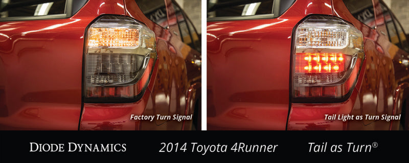 Features Converts your tail light to also function as the turn signal. OEM tail light connectors for simple plug-and-play installation. Assembled in USA. Overview Custom Appearance. This kit is compatible with Toyota 4Runner 2014-2021 and will convert the LED tail light to also function as the turn signal. This kit will instantly customize your vehicle for a much more modern appearance on the road! This module does not include the option to convert your old turn signal location into additional backup lights. Easy Installation. Using OEM tail light connectors, the base kit is 100% plug-and-play and installs in minutes, with no wiring required. You don't even have to remove your tail lights! Experience. After over a decade in business, Diode Dynamics is the most trusted name in automotive LED lighting. Unlike every other LED distributor, we assemble and engineer products ourselves in the United States, for high quality and fast time-to-market of the newest and brightest LED technologies. We pride ourselves in offering only quality LED products that will exceed your expectations. Please contact us if you'd like to discuss your lighting project! What's Included Two (2) modules compatible with Toyota 4Runner 2014-2021 One (1) Installation Guide