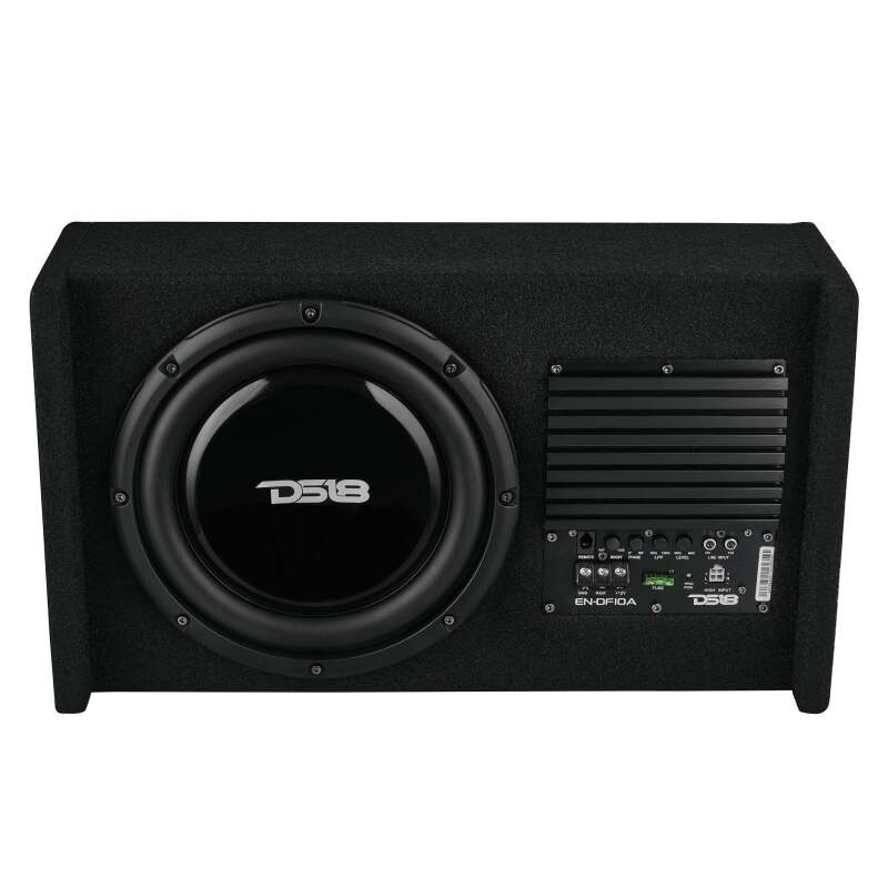 DS18 Single 10in Shallow Subwoofer & Enclosure 300 Watt RMS Downfiring Sealed Black Carpet Amplified