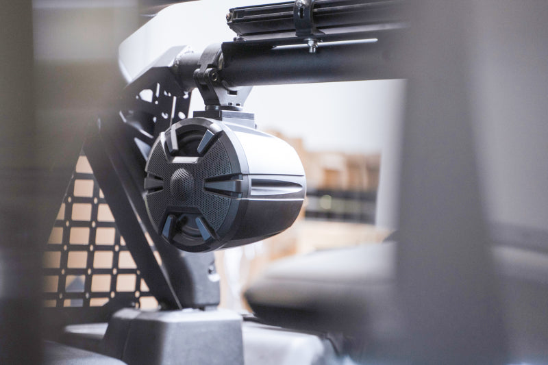 Our Rear Speaker & Light Bar mount features a 2-inch diameter tube that is perfect for mounting speaker cans with roll bar clamps. The bar also features a mounting point for up to a 20-inch single row light bar for rear facing lighting. There are additional mounting holes that can be used to mount other accessories such as a Hi-Lift or additional speakers. We provided provisions for clean wire management. Installation is simple, and consists of only 4 bolts to get it mounted.