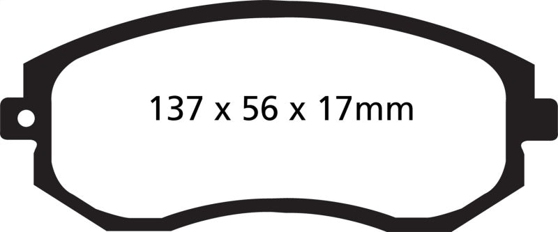EBC Yellowstuff is an aramid fibre based brake compound with high brake effect form cold and is possibly one of the first ever compounds that can be used for STREET AND TRACK DRIVING. These pads do not require warm up but do get even stronger under the heat of hard driving. These are not a low dust pad and if your desire is for a low dust premium street use pad, you should consider EBC Redstuff.When considering full race use, Yellowstuff has been a strong favourite, having been used for two years in the Swedish Camaro Cup and at numerous other race events where a stock caliper system is fitted.It is also the choice of 90-percent of the Mazda MX5 Miata competitors in the UK race series and has an unblemished record as rotor friendly track pad for vehicles up to 2000 lbs weight or 200 BHP.In the USA the SCCA and NASA drivershave been testing Yellowstuff with feedback and good reports POURING in from a 543 test driver major market proving event with these groups. Read that figure again 543 test drivers.There is no guesswork here.