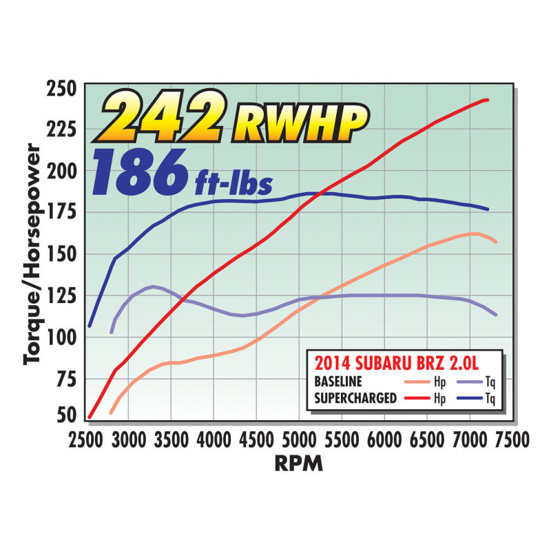 The Edelbrock Stage 1 Street Supercharger System part #1556 for 2012-19 Scion FR-S, BRZ, or Toyota GT86 increases the performance of your 2.0L engine to 242 horsepower and 186 ft-lbs of torque at the rear wheels. This Edelbrock Supercharger System is designed exclusively for the FA20/4U-GSE engine. Its unique inverted design utilizes the Eaton 1320 TVS rotor assembly for maximum efficiency in a compact package. This system features an efficient high flow inlet configuration that results in a shorter, less restrictive intake path for improved airflow and performance. An air-to-water intercooler and front mount heat exchanger deliver a cool, dense air charge resulting in dramatically improved performance, especially in the mid-range, where power dips have been eliminated for a smooth linear power curve. The supercharger assembly is finished with a durable black powder coating with red accents for a unique look that will let everybody know your car is Edelbrock supercharged! The Edelbrock #1556 system is 50-state emissions legal. The supplied tune is intended for completely stock vehicles with the exception of a cat-back exhaust.