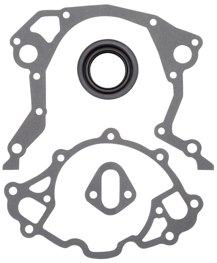 Edelbrock part #6991 Front Cover Gasket set for Small-Block Ford. Includes front cover gasket and front seal.