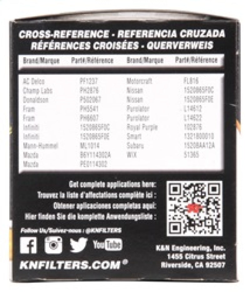 | K&N premium oil filters are meticulously engineered to offer outstanding filtration and engine protection. Designed to operate with all synthetic, conventional, and blended motor oils, K&N's pleated synthetic-blend filtration media helps to shield your engine from contaminants and ensure a consistent flow of oil. The heavy-duty canister is engineered to be exceptionally durable, and a one-inch welded hex nut can be used for quick and easy filter removal. Each filter is specifically designed to withstand the service intervals recommended by vehicle manufacturers, and is protected by the K&N 1-Year Limited Warranty. This Part Fits:
