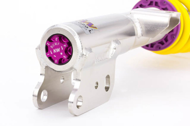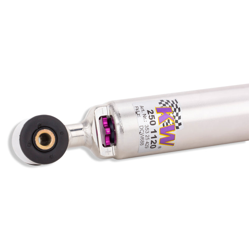 Cutting-edge motorsports technology for more performance on the road. Like every suspension product developed by KW automotive, the suspension manufacturer, and manufactured in Germany, the KW V3 Coilover suspension kit also provides a significant plus in safety reserves in road traffic. Thanks to the chassis with its high-quality dampers, springs, and elastomer spring elements, pitching and rolling movements during load changes such as evasive maneuvers, cornering, acceleration, and braking are significantly reduced. The braking distances are also shortened. Thanks to improved support and feedback, drivers not only feel safer but driving in everyday life becomes even safer. With compression and rebound stage damping, that can be set separately and independently of each other, the damper setup can be customized to your personal driving preferences or vehicle changes such as weight, tire characteristics, or altered vehicle rigidity. True performance optimization is only possible with this unique, patented system. For example, this allows the compression damping force to be increased and get more grip from the tires, to improve cornering behavior and reduce squat without simultaneously altering the rebound stage damping which is optimally matched to the spring rate, a scenario which results in reduced grip and the associated loss of performance. The KW V3 coilover kit is the ideal tool for performance-oriented drivers and experienced tuning enthusiasts who place a strong emphasis on the overall performance of their suspension. The Variant 3 features patented TVR-A and TVC-A technology that provides separately adjustable rebound and compression damping. The extensive adjustment range of the independently configurable rebound and compression make it easy to directly influence the steering behavior, directional stability, grip and handling characteristics for confident and repeatable results at the limit of driving dynamics.