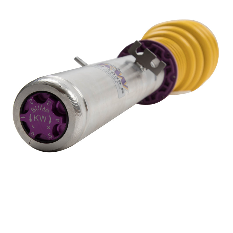 Cutting-edge motorsports technology for more performance on the road. Like every suspension product developed by KW automotive, the suspension manufacturer, and manufactured in Germany, the KW V3 Coilover suspension kit also provides a significant plus in safety reserves in road traffic. Thanks to the chassis with its high-quality dampers, springs, and elastomer spring elements, pitching and rolling movements during load changes such as evasive maneuvers, cornering, acceleration, and braking are significantly reduced. The braking distances are also shortened. Thanks to improved support and feedback, drivers not only feel safer but driving in everyday life becomes even safer. With compression and rebound stage damping, that can be set separately and independently of each other, the damper setup can be customized to your personal driving preferences or vehicle changes such as weight, tire characteristics, or altered vehicle rigidity. True performance optimization is only possible with this unique, patented system. For example, this allows the compression damping force to be increased and get more grip from the tires, to improve cornering behavior and reduce squat without simultaneously altering the rebound stage damping which is optimally matched to the spring rate, a scenario which results in reduced grip and the associated loss of performance. The KW V3 coilover kit is the ideal tool for performance-oriented drivers and experienced tuning enthusiasts who place a strong emphasis on the overall performance of their suspension. The Variant 3 features patented TVR-A and TVC-A technology that provides separately adjustable rebound and compression damping. The extensive adjustment range of the independently configurable rebound and compression make it easy to directly influence the steering behavior, directional stability, grip and handling characteristics for confident and repeatable results at the limit of driving dynamics.