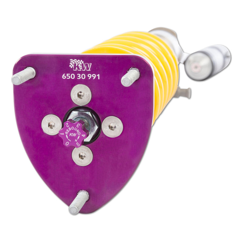 Using the Nordschleife as it's testing grounds and the 7-post rig, KW developed it's V4 Clubsport coilover kit. Wheel loads, vehicle weight and chassis reinforcements (increased body stiffness) can all be taken into consideration with Adjustment -capabilities of the V4 Clubsport. The KW Clubsport coilovers combine KW's high-end racing technology -with maintenance-free KW OEM quality components. Designed to provide you the ideal product to utilize the full potential of your sports car during autocross, track days, high performance drivers education (HPDE) courses, club racing, and is tested rigorously on race tracks such as the Nurburgring Nordschleife. Race teams rely on KW's ra cing expertise and experience for their vehicle setup. This same championship winning pedigree is mirrored in the development of each one of the KW Clubsport coilover systems. Similar to the KW Competition suspension used in international motorsports, the KW V4 Clubsport coilover kit allows fine tuning of the compression damping separately in the low-speed and high-speed range. The click adjustments of the TVCLH-A valve technology -ake for easy Adjustment -directly on the reservoir. You can modify the low-speed compression damping with 6 precise clicks with the purple low speed Adjustment -ial and directly beneath it the golden Adjustment -heel provides an additional 14 precise clicks of high speed compression adjustment. In addition, the TVR-A technology -provides 16 clicks to noticeably adjust the rebound damping independently of the compression damping. If you would like to adjust the KW V4 Clubsport coilover kit it can easily be adjusted for more comfort or to an alternative setup for a new race track. The KW V4 Clubsport benefits from the same motorsports technology -hat has proven its endurance with multiple overall wins at the ADAC Zurich 24h Nurburgring race.