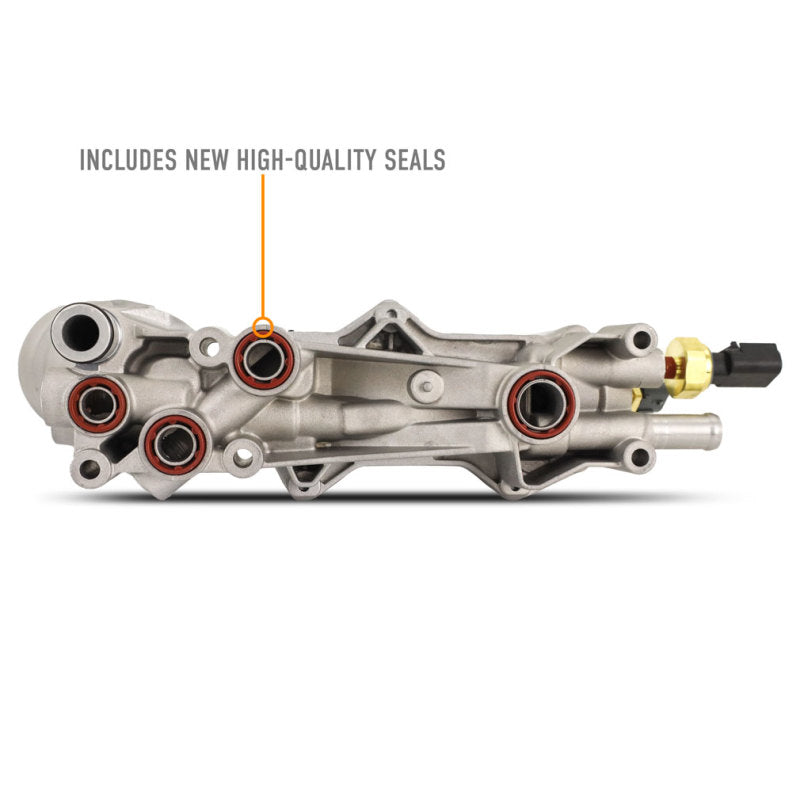 but they're not without their flaws.----The stock 3.6 oil filter housing is made from plastic and is known to become brittle after repeated heat cycles. When that happens, even the slightest amount of torque on the filter cap while performing an oil change can be enough to crack the housing and cause significant oil leaks. To make matters worse, the oil filter housing lives underneath the intake manifold, making it difficult to identify and diagnose the leak. Oil running down the back of the engine can look like a failed rear-main seal and end up costing you thousands in parts and labor, only to have the problem continue. Luckily, Mishimoto offers a solution to prevent the headache of chasing down oil leaks and give you peace of mind.----Our all-aluminum 3.6/3.2L Pentastar oil filter housing kit is a complete safeguard against frustrating oil leaks. As the name suggests, our oil filter housing swaps the stock brittle plastic for a robust aluminum replacement. This housing is significantly stronger than the stock polymer version and won't become brittle over time. We've also upgraded the seals to Viton for improved oil and fuel resistance, ensuring a long service life. This complete kit includes the aluminum housing, oil filter, filter cap, intake manifold gaskets, filter housing seals, heat exchanger, oil temp and pressure sensors, and bolts, making it a one-stop solution for your Pentastar. Like all Mishimoto products, this 3.6L/3.2L Pentastar aluminum oil filter housing kit is backed by our Mishimoto Lifetime Warranty, for a lifetime of leak-free reliability.