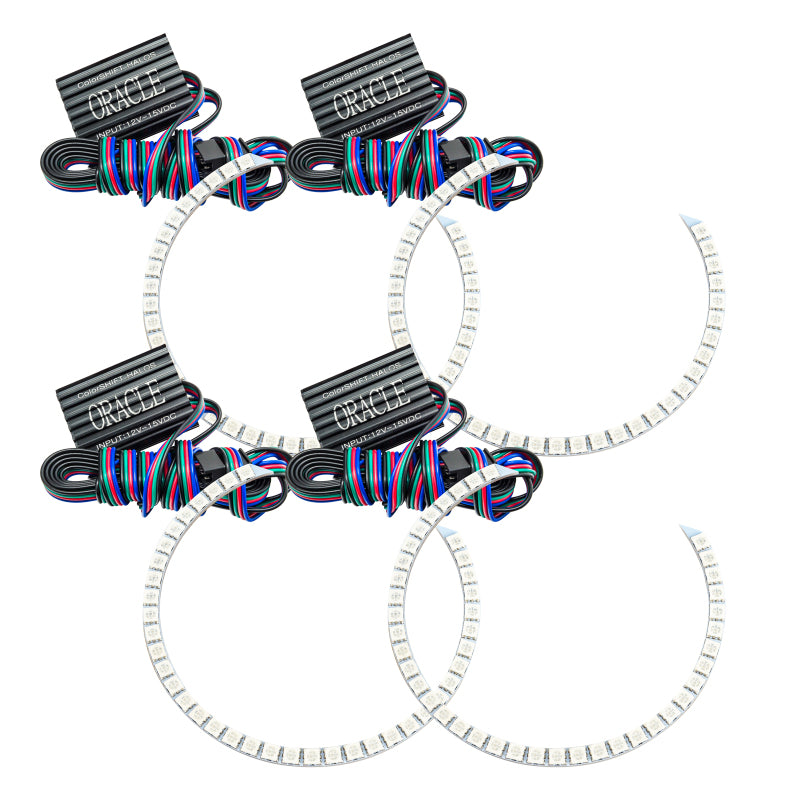 The ColorSHIFT(tm) Halo Kit can produce any color including whites from 3000K-15000K with the push of a button. This allows the user to dial-in the exact color rings that they desire. These 3-Chip 5050 SMD rings are BRIGHT, and for some they may be too bright, that is why (for the first time) the user has full control over the ring brightness. ORACLE SMD or "Surface Mount Diode" Halos utilize an advanced type of LED chip that can produce brilliant light output while only consuming a small amount of power. The SMD chips are installed onto a CAD designed 6-layer PCB (Printed Circuit Board) which is very sturdy and will not break if pressured. The PCB can easily be mounted to a headlight housing using the pre-installed 3M adhesive tape backing.