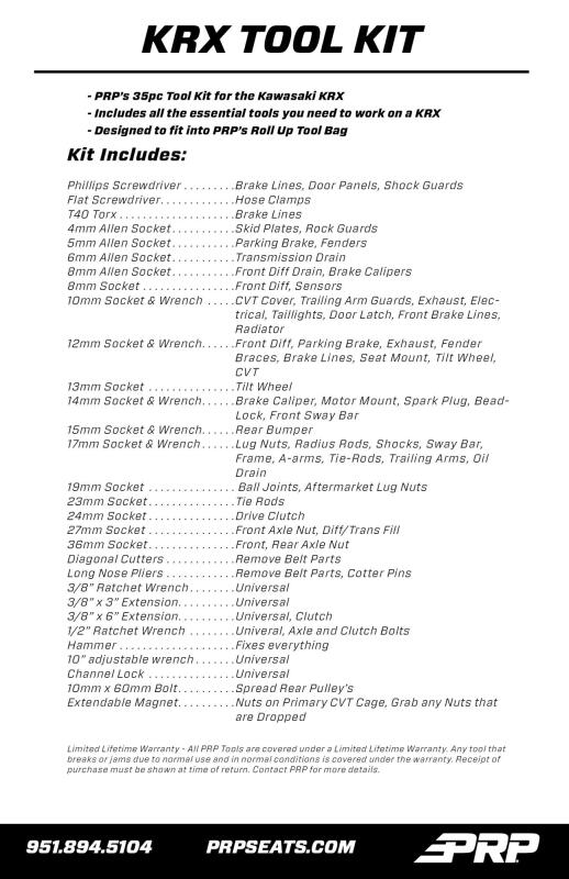 PRP's Kawasaki KRX Tool Kit provides everything you need to fix your Kawasaki Teryx KRX or KRX4 out on the trail. This 35 piece kit includes a selection of high-quality ratchets, sockets, wrenches, extension bars, pliers, and a ball peen hammer (for when things get really fun). We've hand picked the exact tools that are needed most when working on a KRX - So you have only the essentials that you really need, without adding the extra weight of an entire tool box. Below we have listed all the tools included, along with a handy guide to the most common uses for each tool. Each tool also includes a Limited Lifetime Warranty. This Kit includes Tools only. Designed to fit into PRP'S Roll Up Tool Bag. (Bag sold seperately or in our Combo Kit) Fitment: Kawasaki Teryx KRX & Kawasaki Teryx KRX4 KIT INCLUDES: ALLEN Sockets 4mmx3/8 - Skid plate, rock guards 5mmx3/8 - Parking brake, fenders 6mmx3/8 - Transmission drain 8mmx3/8 - Front diff drain, brake caliper TORX BITS- Sockets T40x3/8 - Brake lines SOCKETS/WRENCHES 8mmx3/8 - Front diff, sensors 10mmx3/8 - CVT cover, trailing-arm guards, exhaust, electrical grounds, taillights, door latch, front brake lines, radiator 10mm End Wrench 12mmx3/8 - Front diff, parking brake, exhaust, fender braces, brake lines, seat mount, tilt wheel, CVT 12mm End Wrench 13mmx3/8 - Tilt wheel 14mmx3/8 - Brake caliper, motor mount, spark plug, bead locks, front sway bar 14mm End Wrench 15mmx3/8 - Rear bumper 15mm End Wrench 17mmx3/8 - Deep Socket Lug nuts, radius rods, shocks, sway bar, frame, A-arms, tie-rods, trailing arms, oil drain 17mm End Wrench 19mmx1/2 - Deep socket Ball joints, aftermarket lug nuts 23mmx1/2 - Tie-rods 24mmx1/2 deep socket - drive clutch 27mmx1/2 - Front axle nut, diff/trans fill 36mmx1/2 - Front/Rear axle nut EXTRAS Phillips Screwdriver: Brake lines, door panels, shock guards, firewall Flat Screwdriver - Hose clamps Needle nose Pliers - Cotter pins, remove belt parts Channel Lock Diagonal cutter - Remove Belt Par