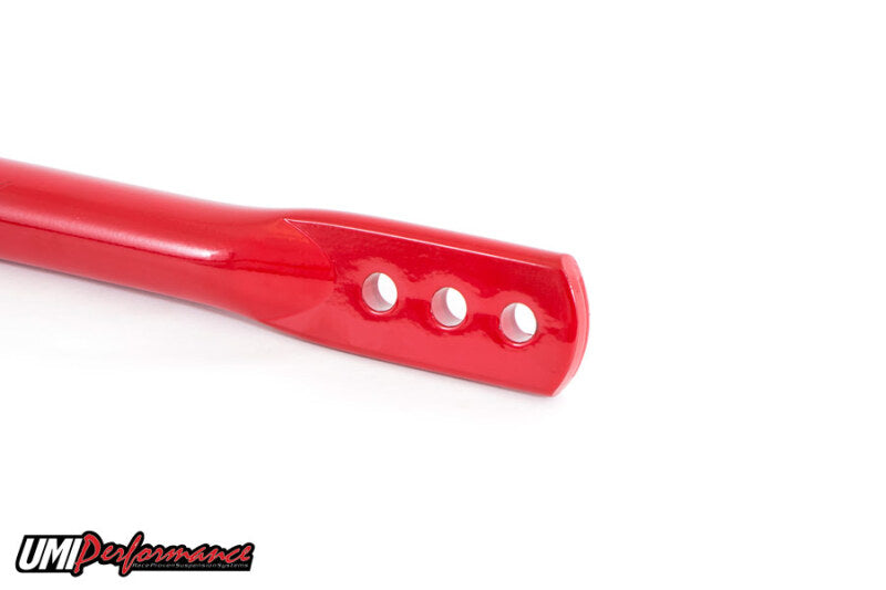 UMI's G-Body Pro-Tour style bar is a true multi purpose high performance rear sway bar. The chassis and differential housing mounts reduce bind normally associated with the factory style bars. The bars are 1" diameter hollow and feature three different rates (street/auto-x, road race/strip). UMI's tried and true CNC machined clamping system allows differential housing mounting on 2.75", 3" and 3.25" diameter housings. These can be bolted on, or welded for additional security. The double shear chassis mounts are held in place by four 3/8" fasteners. Drilling through the crossmember is required and a template /instructions are included. The house made hex adjuster allows pre-loading of the bar when used for drag applications so your car leaves straight. Choose the longest hole for street, middle hole for auto-x, road race and the shortest hole for drag use.