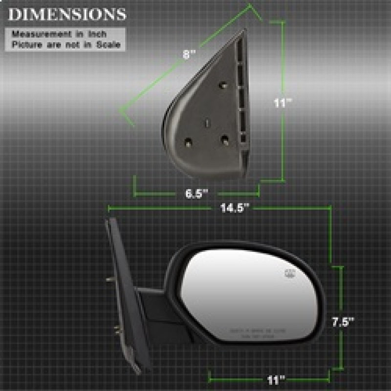 XTune Door Mirror; RH(Passenger) Side; Power Heated; Shiny Black;This Part Fits: Year Make Model Submodel 2014 Chevrolet Silverado 1500 High Country 2009-2013 Chevrolet Silverado 1500 Hybrid 2007-2013 Chevrolet Silverado 1500 LS 2007-2014 Chevrolet Silverado 1500 LT 2007-2014 Chevrolet Silverado 1500 LTZ 2007-2014 Chevrolet Silverado 1500 WT 2010-2013 Chevrolet Silverado 1500 XFE 2007-2014 Chevrolet Silverado 2500 HD LT 2007-2014 Chevrolet Silverado...
